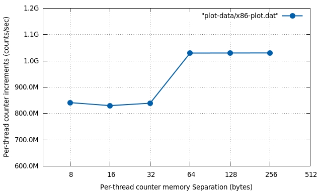 So I decided to flip this around, and have per-thread counters that were closely spaced and do some counting with them. Instead of using __thread, I created an array of counters, each element belonging to some thread. The counters are still separate and not shared, but they may still be in shared cache-line causing the nasty effects we talked about, which I wanted to measure.